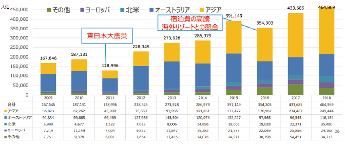 外国人宿泊延数の推移(国別10年比)(倶知安町:2008ー2018)